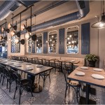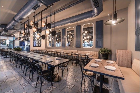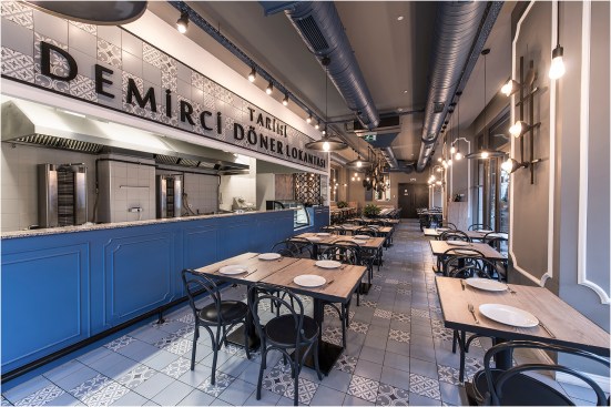 In Demirci Restaurant, in order to complete the eclectic design, starting from the entering space, while the spirit of the history stylized by combining with all the details of the place, the sky-blue traditional floor tiles had been floored randomly by conceptualizing them with a modern manner.