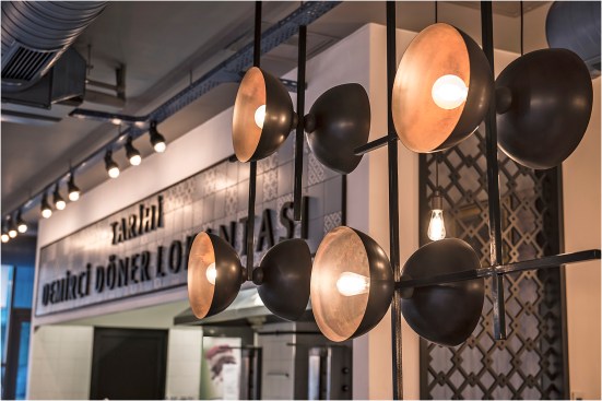 The lighting unit designed by Caglayan Architects by thinking all the implementation details and considering the spirit of the place, while encasing oxidized vintage bronze lighting bowls with the linear formed pieces.