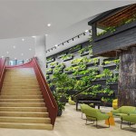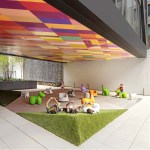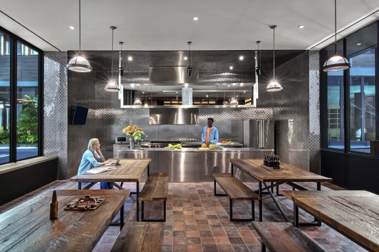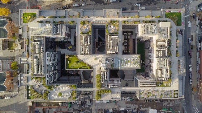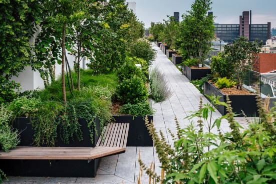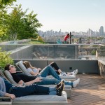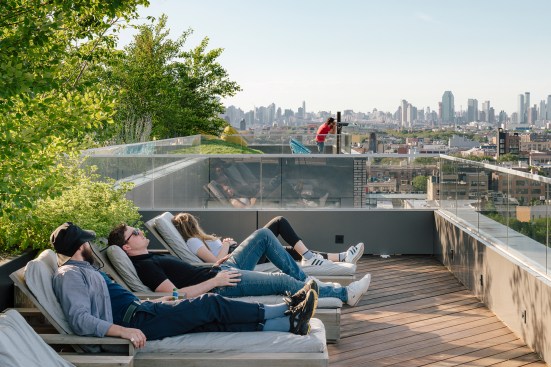 Open space is reprised at the top of the complex, with each roof having about 30,000 square feet of open landscape with a variety of experiences, including urban farming, lounge areas, fireplaces, barbecue grills, and a mini-golf course. The rooftops provide expansive views of the city, with Manhattan’s skyline just