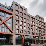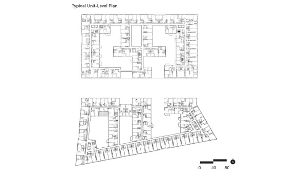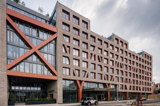 This experimental approach extends into the layout of Denizen’s two buildings, which flank the linear park and contain 911 studio, one-, and two-bedroom units. Instead of the standard doughnut configuration that brings light and air into units through a single central courtyard, here, ODA created five courtyards by developing interlocking wings which vary between single-loaded corridors and the more typical double. The buildings have two cores apiece, and there are four public lobbies.