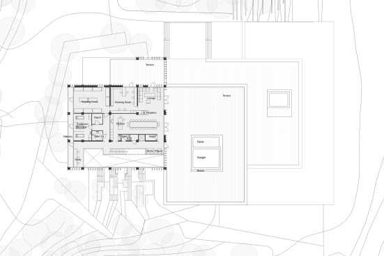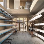 This has become possible through an unfolding of the site’s potential and by entering into dialogue with its different users. The result is a national sports center that makes a difference for the individual athlete and gives something back to the scenic surroundings. An open and welcoming rowing center constitutes the focal point of the sports center's wide-ranging activities – from the activity space (Lunden) around the rowing center and the promenade square in front of the boat hall (Brinken) to the unifying park stretch (Rostadionparken). Instead of being dug into the landscape, the rowing center is built up from the boat hall’s grid structure into a transparent building clad with wood. Outwardly, it opens itself up in several places, revealing its life to the surroundings while also providing a transition between the expansive view over the lake and the denser, recreational forest area. The transition between the lake and the forest is drawn all the way into the rowing center, where the sloping landscape flows through the building and opens it up internally. When moving around inside the building, one thereby has the sense of being situated in the field of tension between the lake and the forest–for example, both the foyer and the boat hall offer views into the forest and across the lake. The varying views across storeys and spatial features give the building a distinct transparency, so you always have the sense of being part of a larger community. Communality is characteristic of the rowing center, where the foyer is designed to accommodate meetings before and after training. Throughout the building, there are nooks and crannies in which users can meet and engage, and throughout the center, a close interplay has been created between the many functions: the foyer, boat hall, workshop, training room, multipurpose room, meeting rooms and administration.