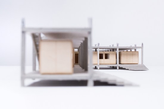 All modules are connected with Munitec plug-and-play connectors that allow for the construction of a building in difficult locations without tools or heavy machinery. The building is arranged linearly, deforming to site conditions. The folding of one linear element creates distinctly different courtyards on the site. The clinic, a storage unit, and two separate small apartments are contained within the wooden lightweight SIP panel volumes and placed within the concrete framework. The building becomes a great pergola, shielding from harsh weather conditions in summer and winter. A large scale facade- and building mock-up was created to study and optimize the system.