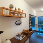 The first level ends with the kitchen a very large space that opens into a terrace that has a very strong personality thanks to the lush vegetation. Another change in the program was to locate the dining room inside the kitchen with a light division done by wood strips and wool threads that resemble a loom. The service door was covered with a curtain to make the space warmer and emphasize its importance inside the space.