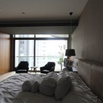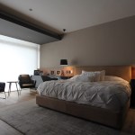 The master bedroom is presented as a suite with a living area that defines a timeless, warm and classic environment where the bed is the centerpiece. It is accompanied by a design piece made of walnut wood with indirect lighting to match the sand-toned leather of the bed.