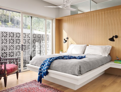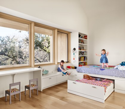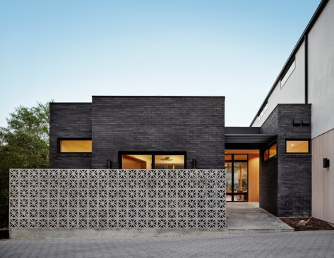 The house is composed of three material masses–masonry, wood and glass, and stucco—that provide functional areas specific to the various family members. These masses carefully negotiate the steeply sloping lot, establishing varied connections to the site’s microclimates while keeping main living functions on an accessible first level.