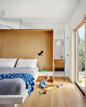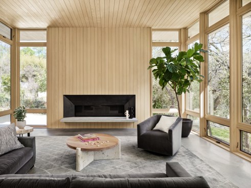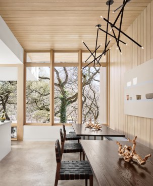 The wood and glass mass, for grandparents and family gatherings, is placed at the mid elevation of the site with views into the trees and over the creek below. Here, the kitchen’s beautiful views and dappled light create a special space for the family to gather and share their love of cooking and gardening.