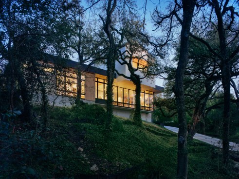 The masonry mass, for guests and utilitarian functions, is located further back on the site where the trees begin to clear. It acts as a threshold between public and private outdoor spaces, while anchoring the house to the site.