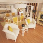 Pentru un plus de eleganta, vom adauga cornise decorative cu diverse modele, iar pentru podea implementan si niste plinte. Ca si material pentru pardoseala din aceste incaperi, ne axam pe lemn triplu stratificat de culoare inchisa care sa se potriveasca cu acest moblier luxos.