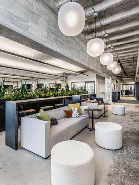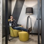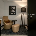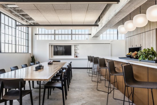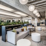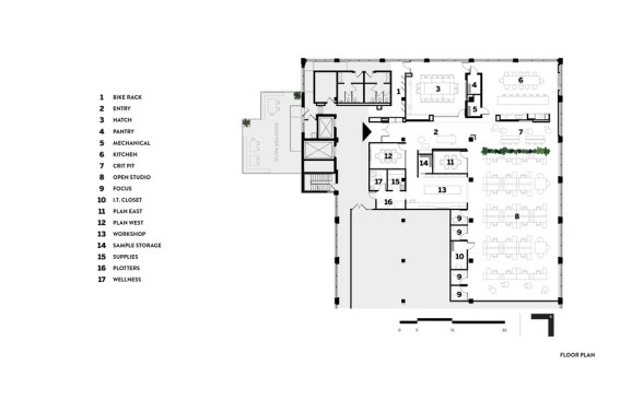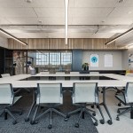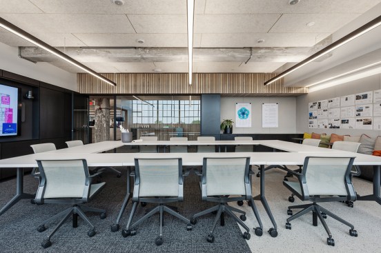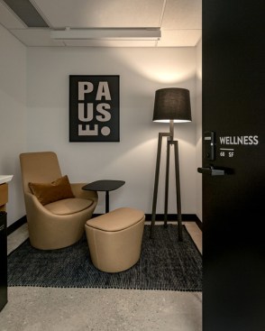 The firm’s commitment to health and wellness extended to the design and materials of their space. Each workspace is positioned to maximize access to natural light. The studio features focus booths, sit-to-stand workstations, and varied work areas, offering a range of postures from lounging to standing. Prioritizing excellent air quality, the design avoids Red List materials, includes a large steel planter wall for biophilic benefits, and uses air quality monitors. A wellness room provides privacy for nursing mothers and others needing a personal retreat.