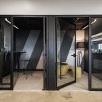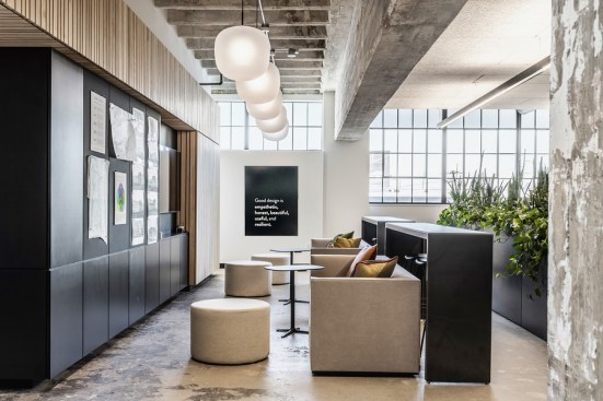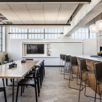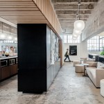 The layout of the space reflects the firm’s values. Eschewing a traditional reception desk, the open entry area leads directly into the communal studio, fostering a non-corporate atmosphere. The absence of private offices for partners or leaders encourages the quick exchange of ideas and learning among all employees. Collaboration areas adjacent to the studio, equipped with digital screens, pin-up walls, a materials workshop, focus booths, and meeting rooms, emphasize the firm’s holistic approach to design.