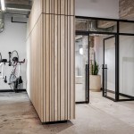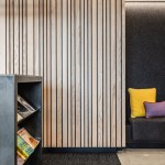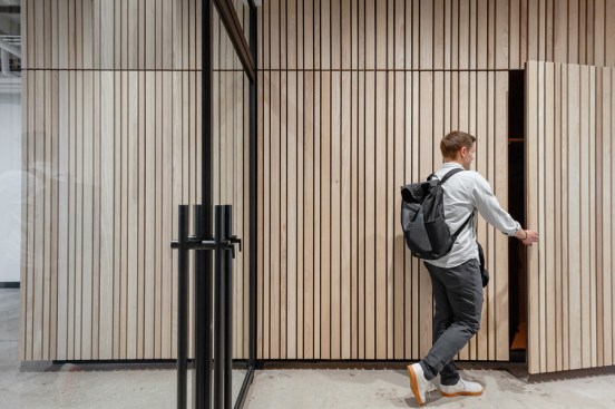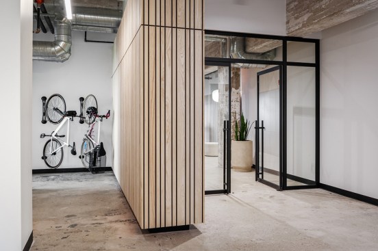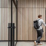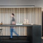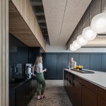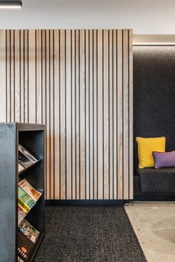 A single, multifunctional wall connects the psychological and physical elements of the project. This wall spans from the entry to the far side of the space, housing various functions like a coat closet, meeting room storage, refrigerator, pin-up space, and kitchen appliances. Its wood slatting and black MDF cladding provide a calm, anchoring element against the bright, open spaces. The wall seamlessly integrates with architectural and structural elements, guiding the eye through the space.