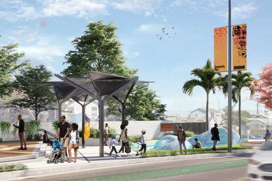 The community, along with design firm Perkins&Will, decided to turn the at-grade condition into a celebration of African American contributions to world culture. Set to complete in 2022, the 1.3-mile-long stretch of art and culture will include 10 pocket parks, hundreds of newly planted trees, 100-plus commissioned works of art, and an array of permanent and rotating art installations. Perkins&Will also plans to leverage existing neighborhood assets to avoid cultural erasure.