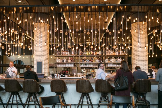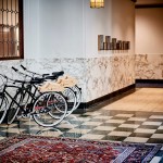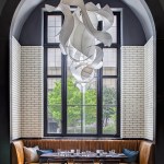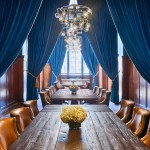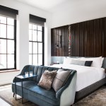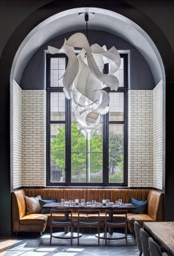 Entering the five-story Neoclassical building through a massive arched, terra cotta-faced portal, originally one of the fire engine doors, guests are transported into a voluminous, story-and-a half space that once housed the fire engines. The space incorporates the check-in experience, lobby, and a restaurant aptly named, “The Apparatus Room.” Existing glazed brick tiles celebrate the building’s history yet the new finishes, decorative lighting, and interior architecture add modernity. An open display kitchen and antique brass metal rail system, reminiscent of a fireman’s pole, runs through the restaurant and highlights the strong architecture. The front desk is comprised of vintage, found furniture credenzas. Video screens behind the desk showcase footage of local artisans and fabricators whose skills, craftsmanship, and art are incorporated into the hotel’s design. Overhead, a feature chandelier, inspired by the building’s history, resembles an abstract smoke-inspired structure.