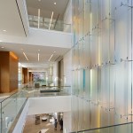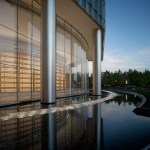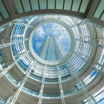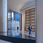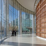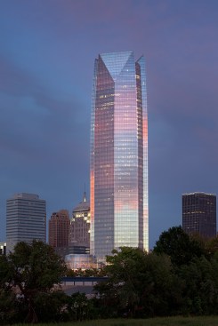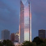 The tower’s height and unique three-sided footprint make it a landmark throughout greater Oklahoma City. The uppermost portion of the tower tapers slightly to enhance its proportions and to produce an elegant, soaring form. At the tower’s top, each face is chamfered to create a triangular form to reflect the sky and offer a subtly changing presence on the skyline. The highly articulated mullion system integrates solar shading and night lighting, and adds richness and texture to the exterior.