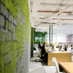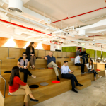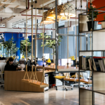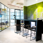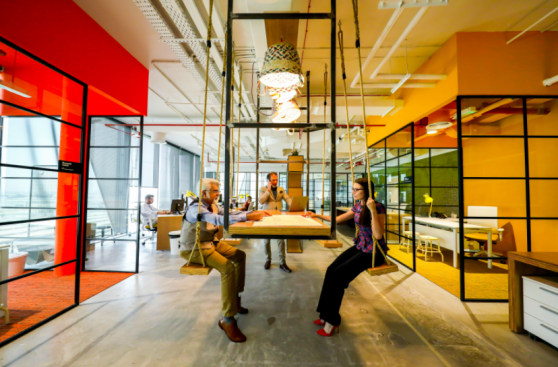 Reflecting the aesthetic of its trendy address, the materials used throughout the 18,000-square-foot workplace contribute to the relaxed attitude required for creative processes to flow. There is extensive use of greenery and disentangled concrete that converts into faux moss on the walls, and quirky decor adds a sense of whimsy (i.e. swings on rope and hanging upside down woven baskets for lampshades).