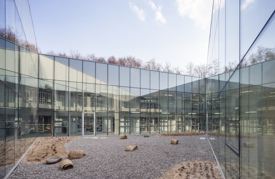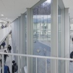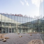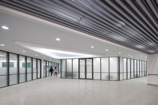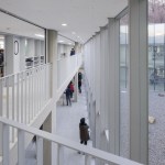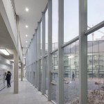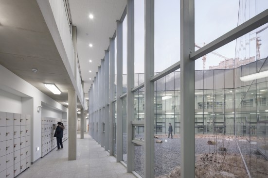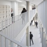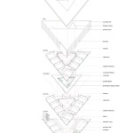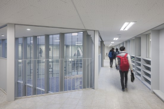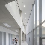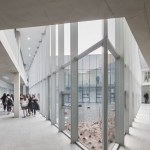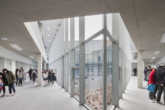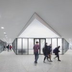 Unlike the complex characteristics of the exterior with three different sides, the interior opens uniformly into the center of the building. On the second and third floors, which have classrooms, is a courtyard looking up at the sky. The transparent internal triangle that divides the courtyard is placed in different angles to the exterior triangle. This discordance creates vertical gaps between floors that connect them into a single space to provide an open view from any spot. This external space located in the center of the building creates a learning environment with a certain level of illumination and functions as a small courtyard with sunlight and wind. The triangular building will become a medium that enables open conversation as a flexible and playful social space.
