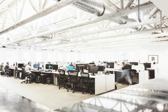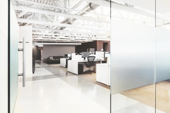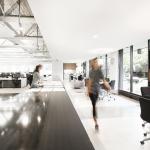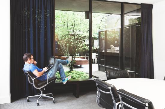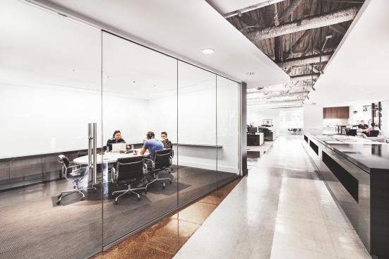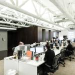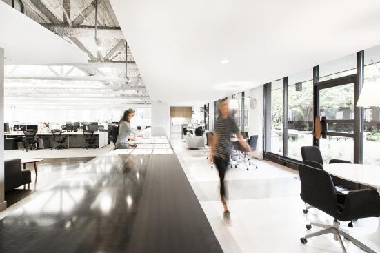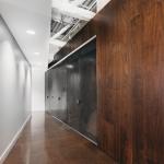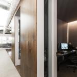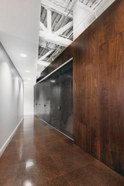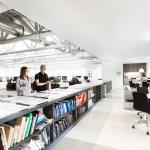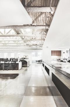 The design for the 8,000-square-foot office curated existing elements of the space, reusing existing materials where possible, and exposing structural elements to create a sense of volumetric richness inside. Murray also introduced a number of new spaces to the program, namely the central core of private photography and video editing suites, which is clad in dark wood and anchors the otherwise light-filled, open-plan office. This central “terra firma” core also contains new storage areas for the company’s digital servers and technology equipment. Perforated metal screens incorporated throughout this central hub offer transparency to otherwise insulated spaces.