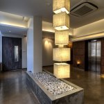 Polished concrete flooring, vitrified flooring ensembling natural stone effect and wooden flooring.