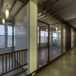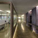 sheet wall paneling of varying thickness in the working zone and splashes of texture paint in the passage area.