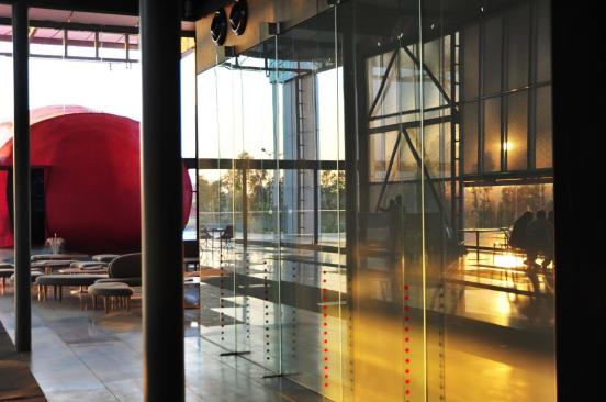 The building should reacts instantly to the environment; since seasons, time zones and durations create different experiences, the building should expresses that change. This dictates the choice of the local materials that are adopted to integrate with the regional context; steelwork that is typical of this area is manipulated for a responsive material palette which is fairly simple comprising of glass, steel, fabric and stone with no timber bring brought in from the outside. Locally available sadarali stone that is typically used to create archetypal freestanding walls to demarcate boundaries in the region is used to further exemplify the cultural continuity as a monolithic sculptural entity in the form of ramps, the water body etc. The longitudinal trusses are clad in a vinyl to express them as a visual element. The flora selection is also regional and berming from the excavated top soil is used to create more gathering space outside that also maximized the moderate climate of the region. Ferns and grasses that change quickly in colour and texture are exploited as a canvas to further enhance the architectural dynamic that creates a unique experience on each visit.
