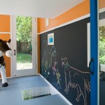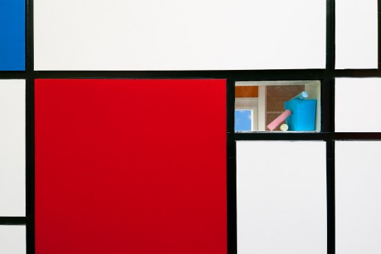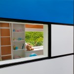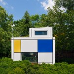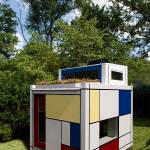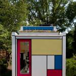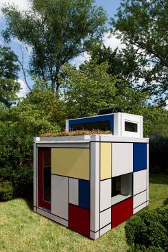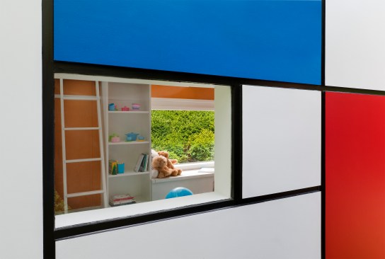 Inspired by Mondrian, the playhouse is elegant while still appealing to children. Inside is a loft for secret club meetings, a chalkboard wall to strategize water pistol battles and a window in the floor to observe what we had hoped would be a fish pond below the playhouse. A solar panel on the upper roof powers LED lights. The lower green roof absorbs rain water, providing insulation and creating a habitat for wildlife that can be seen from the upper windows. Many of the building materials and elements are recycled from other projects where they would have otherwise been wasted. The exterior is constructed of composite materials for low maintenance and long life of the playhouse.