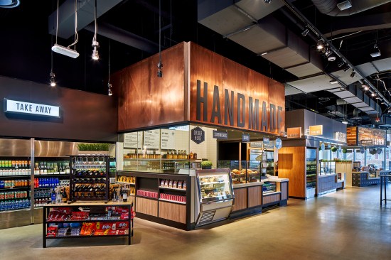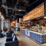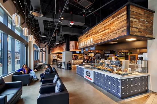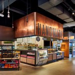 The resulting food stations offer everything from salads to hearty meals and cocktails. Customers can create their own meals or choose from handmade sandwiches, burritos, pastries, and coffee from Zingerman’s of Ann Arbor, MI. The architects worked with the New York graphic design firm Patricia Spencer Design to give each station its own identity, while maintaining a cohesive look throughout the interior. Large letters spelling out the station name are made of acrylic and metal, set onto canopies consisting of copper, lumber, iron ore, steel, stone, and concrete resin, and strategically illuminated to act as signs. The faces of the serving bars are similarly finished in different materials to provide each station with a distinctive character, including porcelain tile resembling wood and Arts and Crafts-style patterned concrete tile. Concrete floors and concrete-resin tables are durable enough to withstand constant use.