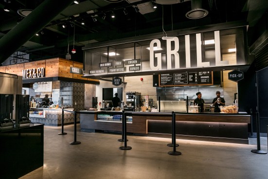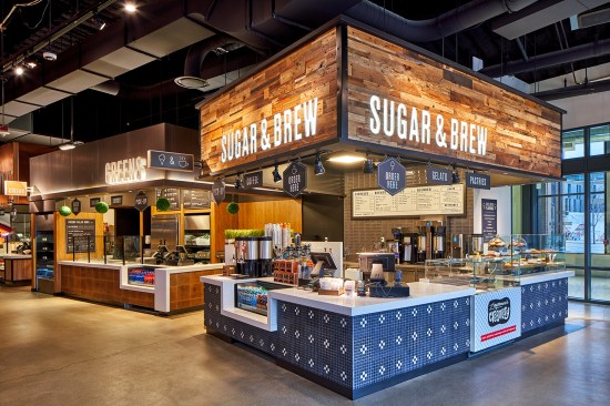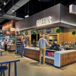 Program: The District Market features five different quick-service food stations: Sugar and Brew, featuring coffee and baked goods from a local bakery, Zingerman’s; Greens (salad bar); Handmade (sandwiches); Grill (meats); Mex and Co (Mexican cuisine). In addition, a centrally located bar called On Ice serves drinks, and another section, Take Away, sells grab-and-go items. Each station is distinguished by freestanding lettering within canopies finished in different materials. The market’s dining areas provides seating for 203 people.