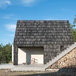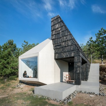 Designed by combining and connecting the two main monolithic volumes, light & dark. These forms merge with the natural environment of low pine vegetation and steep rocky terrain.On the south side, the white portion of the house connects to the outside through a grand picture window, which guides the transition from the artificial to the natural. The black half of the house draws inspiration from original mountain homes. The structure is emphasized through the use of natural materials such astraditional timber shingle cladding.