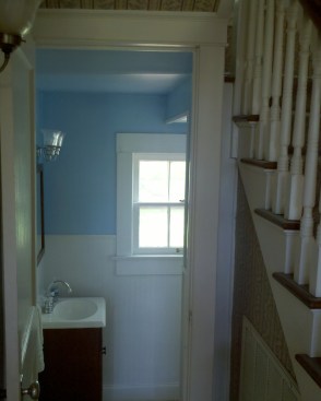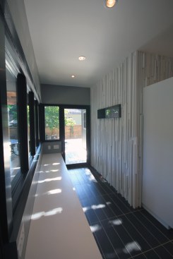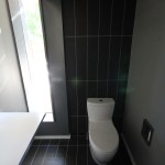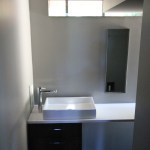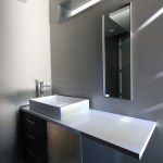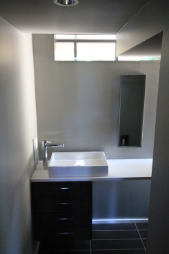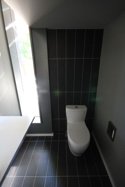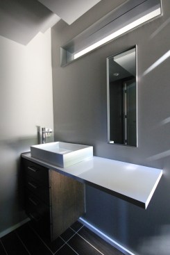 Simple porcelain tiles used in the corridor flow seamlessly into the bathroom through the portal and up the east wall, visually connecting it with the rest of the home. Inside the bathroom, clean lines and a minimal material palette give the space an uncomplicated, yet luxurious, feel. Installed several inches above the floor plane, custom white oak cabinetry seems to float freely on the north wall, mimicking the language of the window and mirror placement above. High efficiency fixtures and low-VOC paint specified in the design ensure that the bathroom is as healthy and economical as possible, bringing a level of dignity and refinement to this previously overlooked space and thus maximizing its appeal.