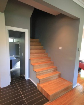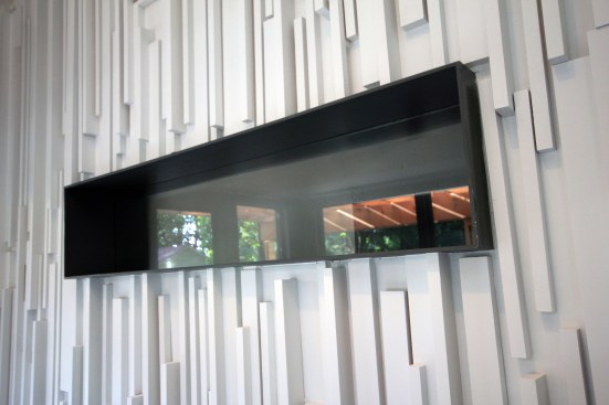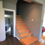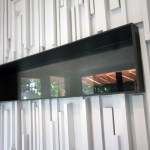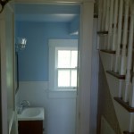 Part of a larger renovation to a traditional 1940s two-story, the existing Doffin Residence Bathroom was a mere 28 SF, tucked beneath the central stair of the home. The client, desperate to improve the aesthetics and functionality of this extremely small bathroom, came to us with a desire to maximize the height and natural lighting of this space. By expanding the footprint a mere 2’ to the north during the greater renovation, we were able to incorporate an 8’ tall window on the east wall that now floods the space with natural light. A 1′ tall horizontal window above the custom cabinetry brings additional ambient light into the space from the glazed hallway beyond, where reclaimed wood from the project is re-imagined as a playfully textured wall.