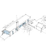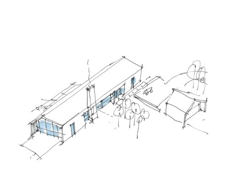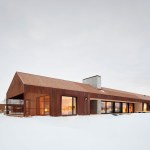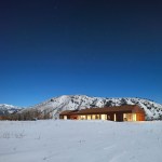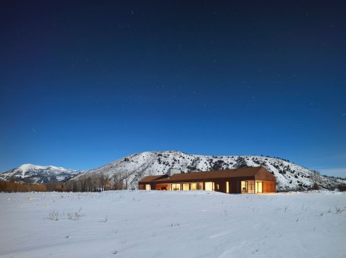 An invigorated interpretation of mountain living, Dogtrot takes its namesake inspiration—the historical “dogtrot” cabin and barn known for their long central breezeways—and unfurls itself before the Teton Range. Sited on an 18-acre meadow, the house’s main volume is oriented along an east–west axis, filling the glazed living spaces with southern light. The second volume—the garage—links to the main area by way of a heroic porch, which signals entry, provides outdoor shelter, and creates a graphic play of light through an aperture in the roof.