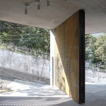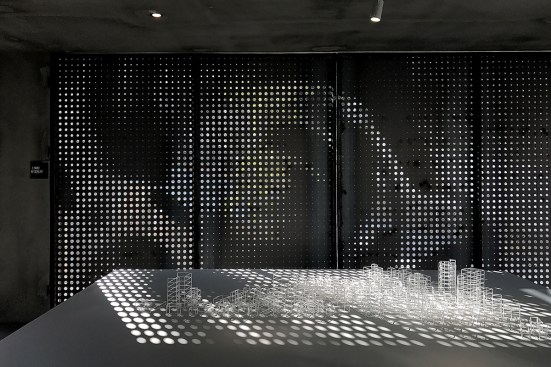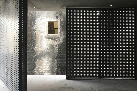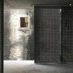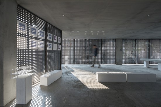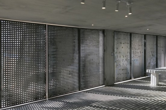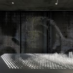 The doors are covered by perforated patterns. In the daytime, sunlight goes through the small holes and leaves shadows on the ground. The light and the shadow, following the rhythm of time, respond to the surroundings in an interesting way.