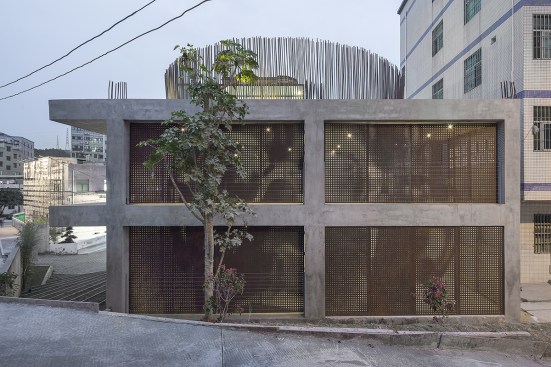 A pavilion called "Dom-Ino" is presented by 2017 Bi-City Shenzhen Biennale of UrbanismArchitecture (UABB) – Sub-exhibition in Shangwei Village. Different from conventional buildings, this pavilion has no walls, but 24 huge iron doors. Doors can be either opened or closed at any angle by rotating, which allows the space to “breathe”.