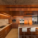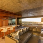 In contrast to the exposed concrete and steel, the architects specified warm and rich finish materials for the walls and floors. The kitchen, bathrooms, and storage are laid out in a wood veneered central core. The wood conceals all of the inner workings of the unit. Speakers, vents and air return are all accommodated through discrete cuts and perforations in the wood veneer. In order to keep the ceiling over the main spaces as high as possible, the architects avoided running ductwork past the wood core.