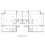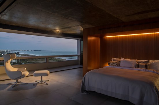 The condominium is on the 15th floor of Siesta Key’s Terrace Building, originally designed by Frank Folsom Smith in 1969. Two corner units were combined into a single continuous condominium space. All interior partitions were removed. The new layout stretches the unit over the full depth of the residential tower. The master bedroom suite looks to the city in the distance while the living space faces the Gulf and the beach on the other end.