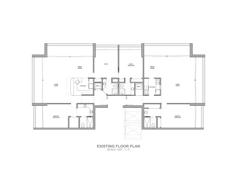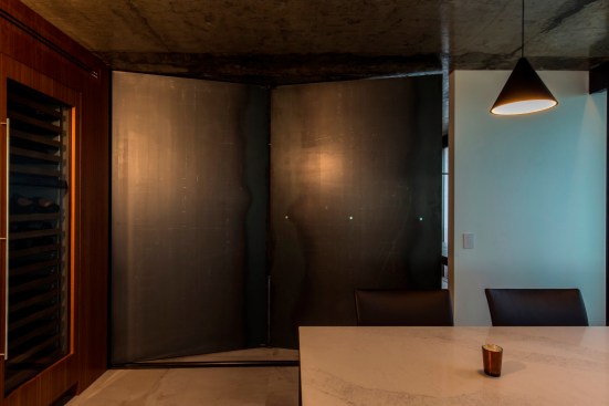 Elements of steel were introduced throughout the unit to compliment the concrete. Ten foot wide steel and wood folding partitions allow the owner to transform the space and to isolate the office from either the living or the master. The partitions fold back into the wood core to reconnect the office with the rest of the unit to form one continuous space. The steel is only revealed when the panels separate the office from the adjoining rooms. Other custom steel elements include a wine bar, the housing for the electric shades, and a steel desk spanning between existing columns.