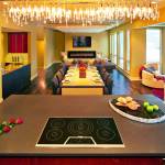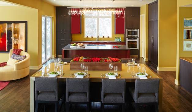 Highlights such as a whole-house smart entertainment system, a massive moveable double island on casters, high-end luxury appliances, and a wet bar located on the main level, provide for flexibility to entertain refined or casual gatherings of any size. The result is a high-tech, new modern look with an industrial feel and a contemporary color scheme appropriate for this vibrant modern family.