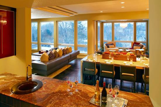 Transparency was paramount to achieving our goals. Material selection was important from the standpoint of lifestyle, as well as resonance with the exterior wildlife views that are visible from nearly every angle. Metal awnings and large-scale slate tile give the home a grounded but urban contrast. Flooring throughout the main level is maple, with an ebony stain, hand hewn to create a lived-in look. It is paired with high-gloss burl, and complimented with vertical grain wood veneers.