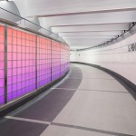 Rockey describes the passive walls as simple white tile and the active wall as a series of inter-changeable modules. The active wall includes EXTECH’s custom-engineered and fabricated glass block system that, in concert with the static white and color changing lights, simulated movement and transparency. A minimal amount of exposed metal framing was specified for EXTECH’s system to maximize the glass surface area and to blend with the concourse’s existing, mortared glass block walls.