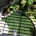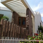 The courts are secured by slender concrete pergolas above which create a play of light and shadow at the same time secure the house from intrusion of thieves.
