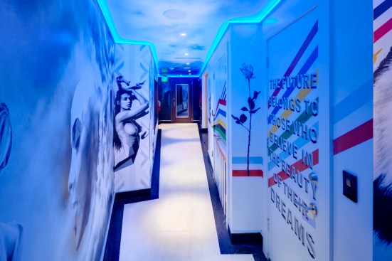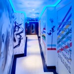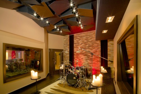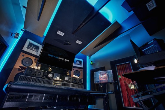 Dream Asylum’s 600 ft2 Live Room/Iso Booth is linked to two primary Control Rooms via below-floor wiring channels, to provide flawless connectivity throughout the complex. The elegant 360 ft2 Control A features handsome, custom-designed wooden wall mounted equipment cabinets which bookend an oversized client couch set on a raised platform beneath a dropped ceiling. A custom designed rear wall wooden resonator, and a dramatic geometrical ceiling cloud distinguish the 269 ft2 Control B. Both control rooms are outfitted with identical (SSL9000 consoles) and WSDG/ Augspurger Monitor Systems. Thanks to impeccable room-within-room isolation, Dream Asylum enables Danja and/or Araica to record live sessions via either control room while a second engineer/producer simultaneously mixes another project. Distinguished by a striking oversized “fan” inspired ceiling cloud; a 192 ft2 mixing/writing room has been created for guest artists.