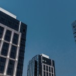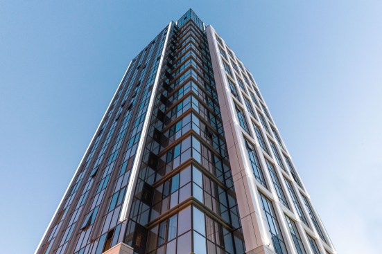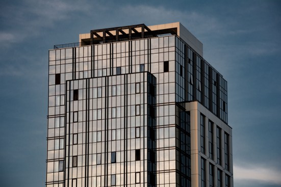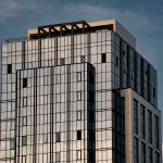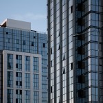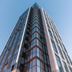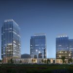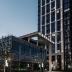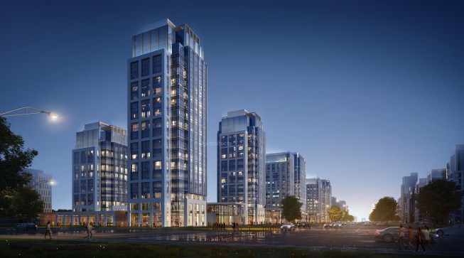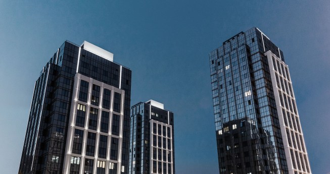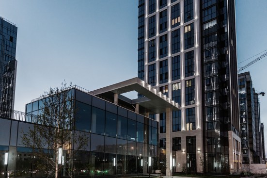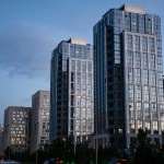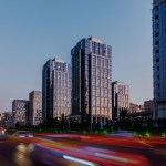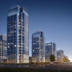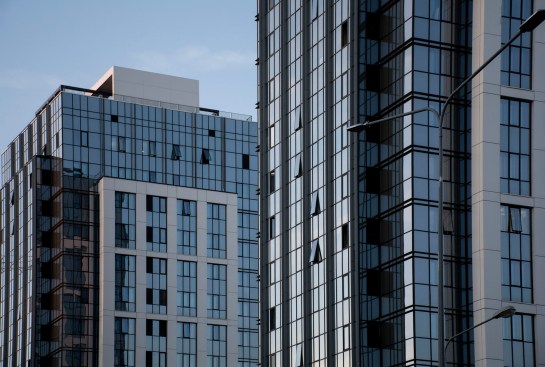 A residential complex of slender rows of vertical towers executed in the high-tech style. Transparent glass covers the surface of the facades, while a minor protrusion of the walls enriches the plasticity of cubic form, creating a chiaroscuro of the surface. A grid of rectangular frames combining the window openings of two floors into one window span creates the illusion of a large-scale increase in the facade – further supporting the monumentality of the overall figurative expression.