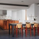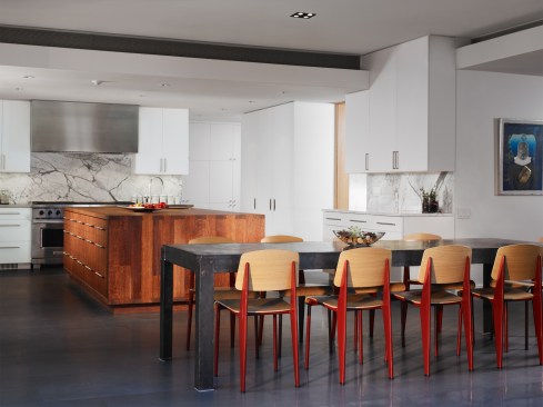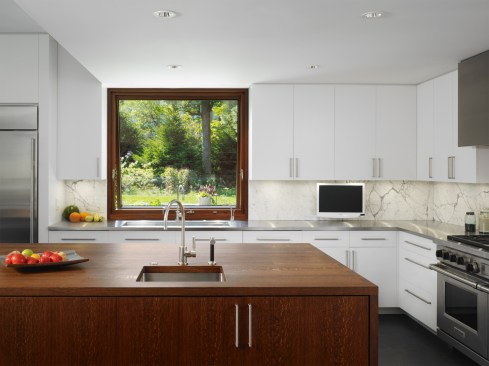 In contrast to the original tightly squeezed and compartmentalized Kitchen, the design removed walls completely opening it up, raised the ceiling and bathed the space in sunlight. Lightly stained woods, simple painted cabinets, stainless and marble countertops and a large English Brown Oak island sit on a warm gray tile floor which grounds the new suite.