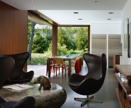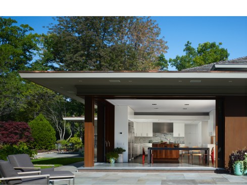 The design expanded the rear of the house, opening it up to the ravine beyond, creating a tranquil and private sanctuary. Along its Southern exposure, oversized ‘Lift Slide’ Mahogany doors instantly wipe out any notion of indoors or out, exposing it to the gardens and new exterior patio.