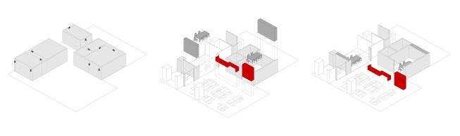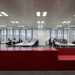 Next to it is a red desk/bench that works as waiting area and informal workspace. It also divides the open office from the meeting rooms and entrance area, giving more privacy to the employees.