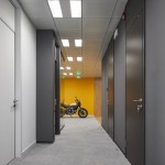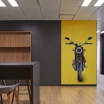 The light and dark colors of the office are complemented by bright accents of red – corporate color of Ducati. Yellow color and shades of light wood are highlighted in the dining area as a tribute to the vintage all-road motorcycle of Ducati, the Scramble, of which a specimen is placed in the nearby living area.