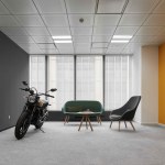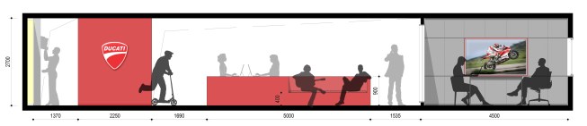 The informal entry with its red color “Ducati” branded wall offers visitors a moment to orient themselves to the space.