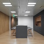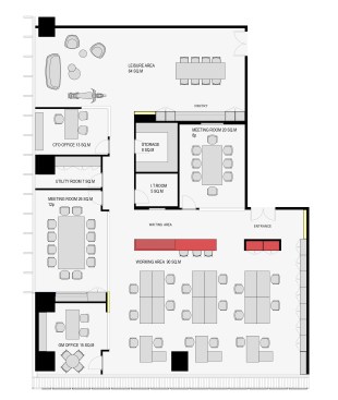 The working space is a collective open work area that consists of the entrance, waiting area, meeting rooms, open office and private offices. The leisure area is a fun and young office retreatment, with café, pantry and living area.