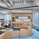 The workspace is likewise designed to emphasize the surrounding city views. Ted Moudis Associates selected 120-degree workstations to maximize collaboration, promote movement, and encourage a friendly environment in contrast to the refined, corporate atmosphere of the client-facing zones. A jade-tinted exposed ceiling maximizes the height and volume of the space and features black linear lights, a continued subtle reference to Ducera’s geometric logo and brand identity.