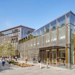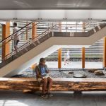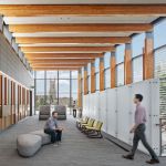 The design’s transparent two-story entry brings natural light into the building and allows for views of the outdoors. To minimize the project’s environmental impact, oak harvested from the site was used extensively for interior surfaces and exterior seating. A contemplative garden reinforces connections to nature and extends to campus pathways. A monumental entry stair follows a translucent wall up through the lobby to celebrate the intersection of care, prevention and social interaction in achieving wellness. Public and private functions are layered—the entry is open, but presents circulation options for students seeking care, privacy, socializing or wellness programs.